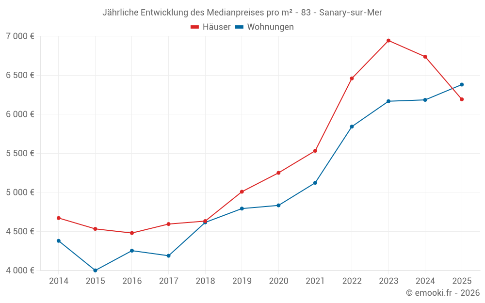 Der Durchschnittspreis auf den 27 Hausgeschäften der letzten 3 Monate in der Gemeinde Sanary-sur-Mer betrug 6 744 € pro Quadratmeter für einen mittleren Immobilienwert von 681 245 €. Über diesen Zeitraum hinweg lagen 60% der Transaktionen zwischen 4 913 und 11 207 € pro Quadratmeter (vom 2. bis zum 8. Dezil).