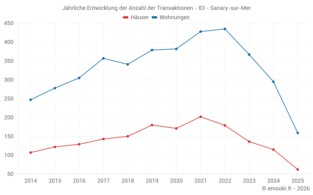 Der Durchschnittspreis auf den 68 Wohnungstransaktionen der letzten 3 Monate in der Gemeinde Sanary-sur-Mer betrug 6 722 € pro Quadratmeter für einen mittleren Immobilienwert von 232 500 €. Über diesen Zeitraum hinweg lagen 60% der Transaktionen zwischen 5 121 und 8 109 € pro Quadratmeter (vom 2. bis zum 8. Dezil).