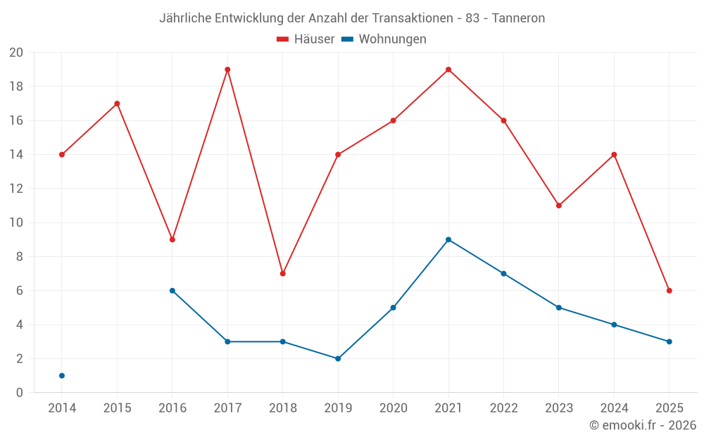 Der Durchschnittspreis auf den 29 Hausgeschäften der letzten 24 Monate in der Gemeinde Tanneron betrug 5 252 € pro Quadratmeter für einen mittleren Immobilienwert von 578 980 €. Über diesen Zeitraum hinweg lagen 60% der Transaktionen zwischen 3 305 und 7 614 € pro Quadratmeter (vom 2. bis zum 8. Dezil).