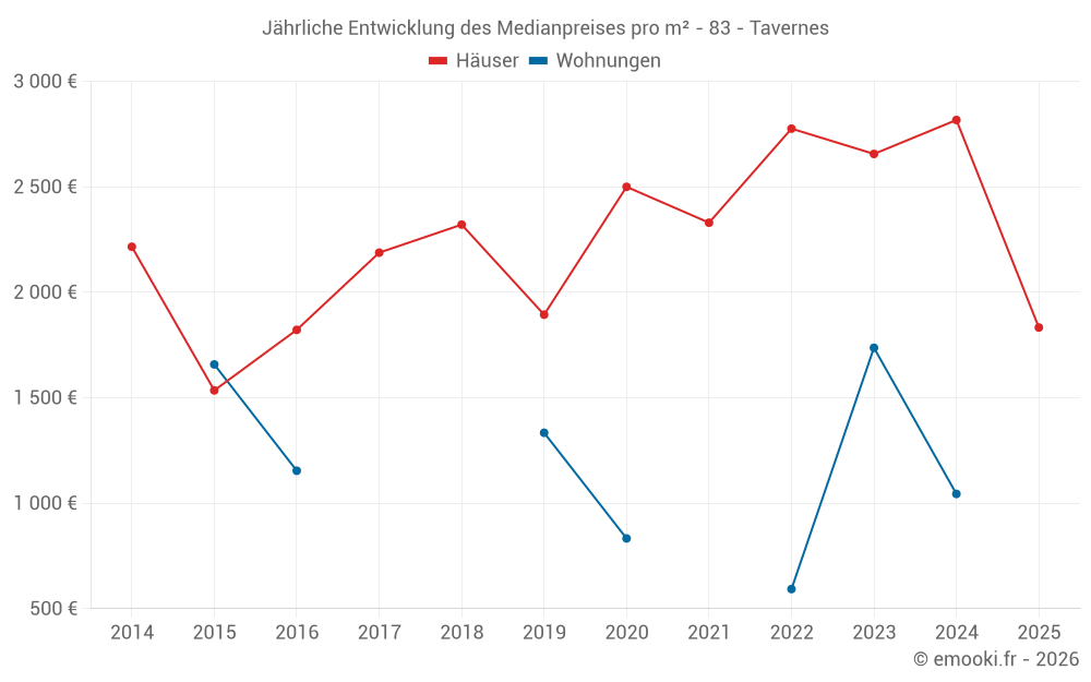 Der Durchschnittspreis auf den 21 Hausgeschäften der letzten 12 Monate in der Gemeinde Tavernes betrug 3 011 € pro Quadratmeter für einen mittleren Immobilienwert von 265 000 €. Über diesen Zeitraum hinweg lagen 60% der Transaktionen zwischen 1 698 und 3 796 € pro Quadratmeter (vom 2. bis zum 8. Dezil).