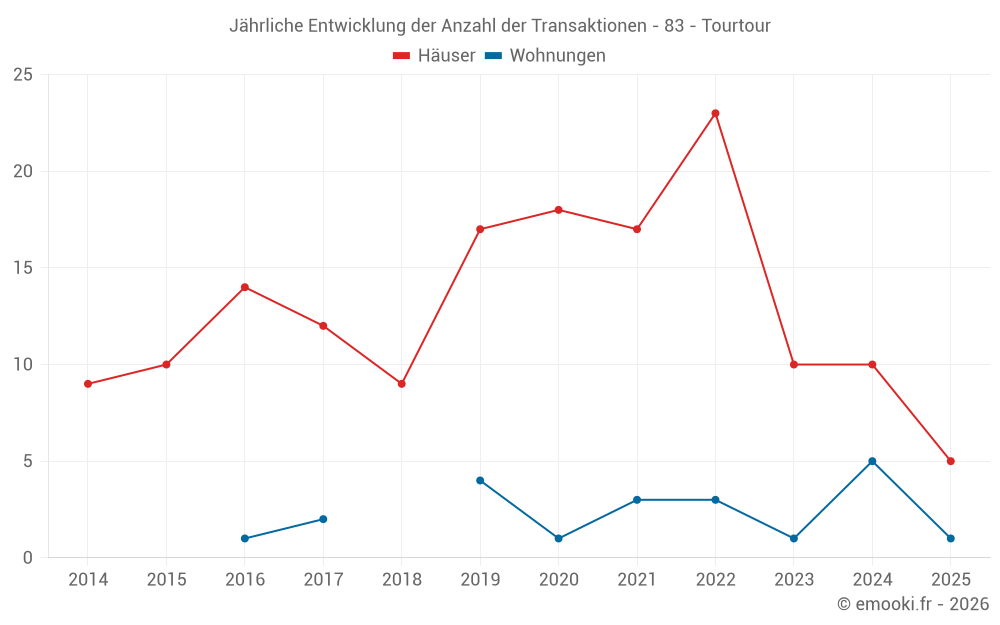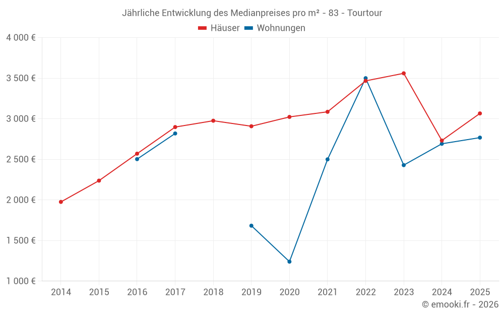 Der Durchschnittspreis auf den 22 Hausgeschäften der letzten 24 Monate in der Gemeinde Tourtour betrug 2 946 € pro Quadratmeter für einen mittleren Immobilienwert von 331 125 €. Über diesen Zeitraum hinweg lagen 60% der Transaktionen zwischen 1 619 und 4 899 € pro Quadratmeter (vom 2. bis zum 8. Dezil).