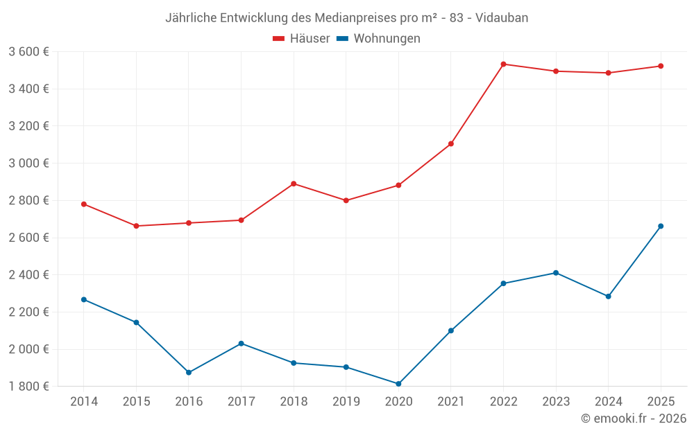 Der Durchschnittspreis auf den 27 Wohnungstransaktionen der letzten 6 Monate in der Gemeinde Vidauban betrug 2 662 € pro Quadratmeter für einen mittleren Immobilienwert von 125 000 €. Über diesen Zeitraum hinweg lagen 60% der Transaktionen zwischen 1 976 und 3 233 € pro Quadratmeter (vom 2. bis zum 8. Dezil).