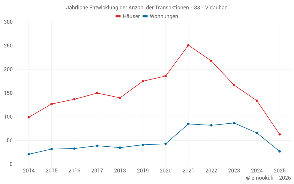 Der Durchschnittspreis auf den 29 Hausgeschäften der letzten 3 Monate in der Gemeinde Vidauban betrug 3 614 € pro Quadratmeter für einen mittleren Immobilienwert von 325 230 €. Über diesen Zeitraum hinweg lagen 60% der Transaktionen zwischen 2 351 und 4 243 € pro Quadratmeter (vom 2. bis zum 8. Dezil).