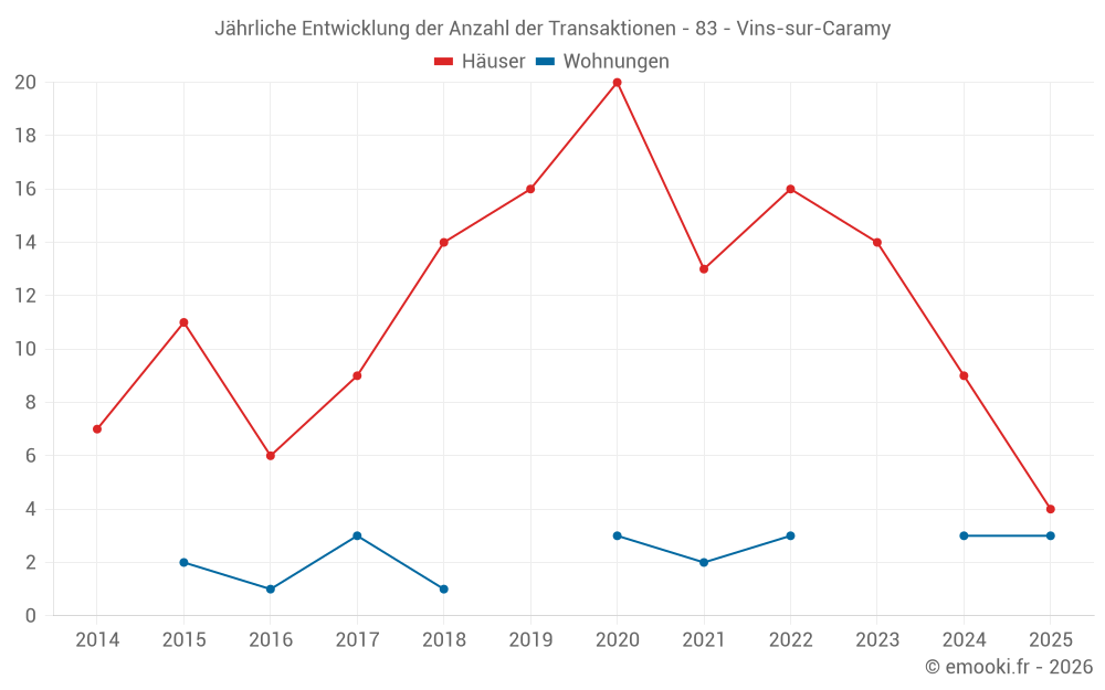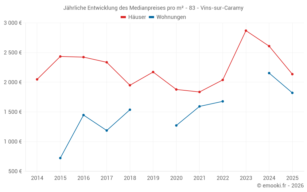 Der Durchschnittspreis auf den 17 Hausgeschäften der letzten 24 Monate in der Gemeinde Vins-sur-Caramy betrug 2 609 € pro Quadratmeter für einen mittleren Immobilienwert von 223 000 €. Über diesen Zeitraum hinweg lagen 60% der Transaktionen zwischen 1 431 und 3 025 € pro Quadratmeter (vom 2. bis zum 8. Dezil).