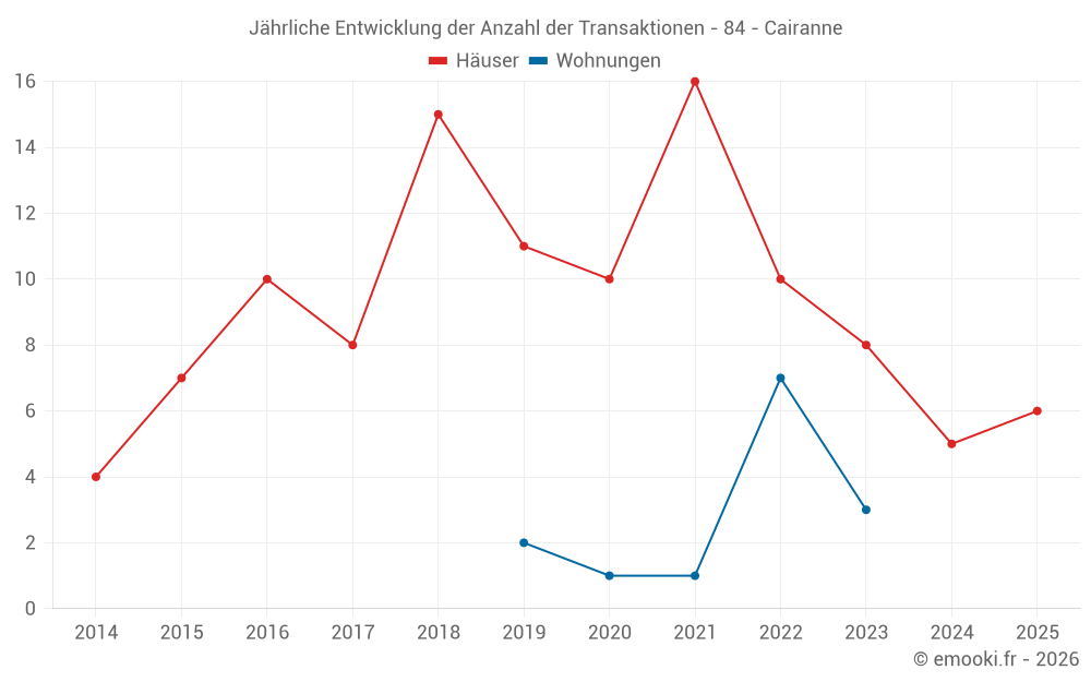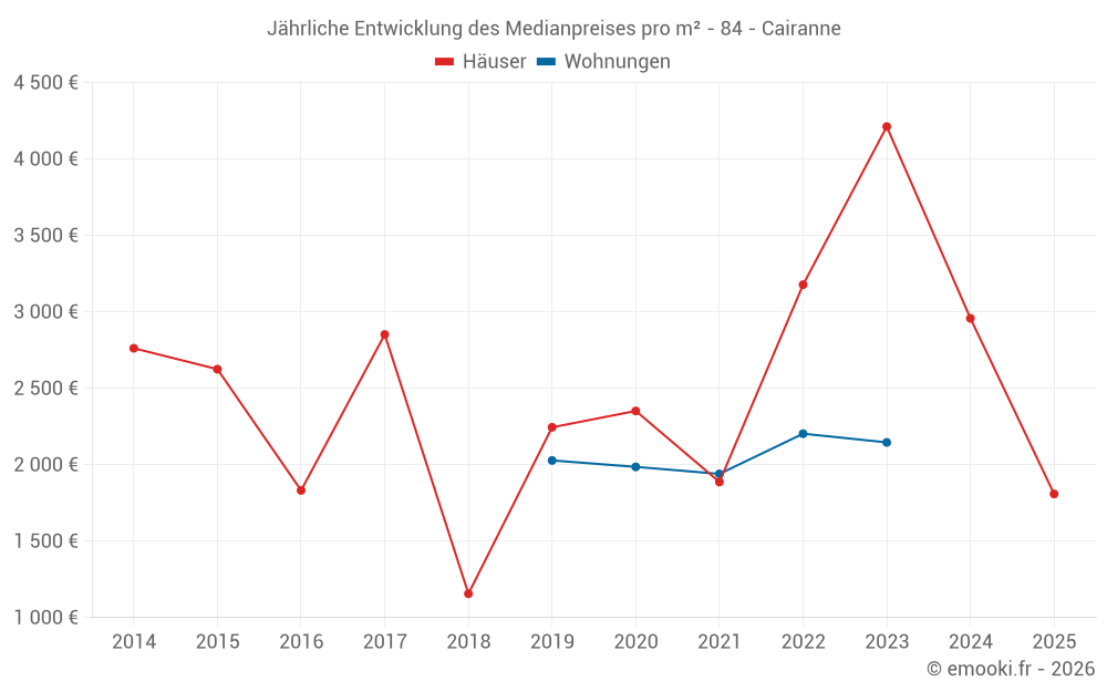 Der Durchschnittspreis auf den 17 Hausgeschäften der letzten 24 Monate in der Gemeinde Cairanne betrug 2 904 € pro Quadratmeter für einen mittleren Immobilienwert von 271 780 €. Über diesen Zeitraum hinweg lagen 60% der Transaktionen zwischen 1 569 und 4 514 € pro Quadratmeter (vom 2. bis zum 8. Dezil).