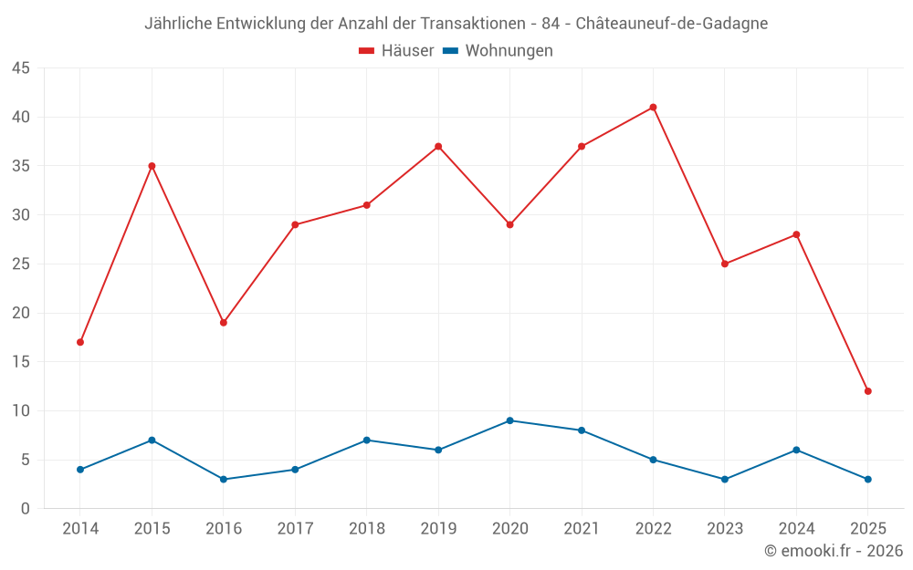 Der Durchschnittspreis auf den 30 Hausgeschäften der letzten 12 Monate in der Gemeinde Châteauneuf-de-Gadagne betrug 3 326 € pro Quadratmeter für einen mittleren Immobilienwert von 354 275 €. Über diesen Zeitraum hinweg lagen 60% der Transaktionen zwischen 2 529 und 3 944 € pro Quadratmeter (vom 2. bis zum 8. Dezil).