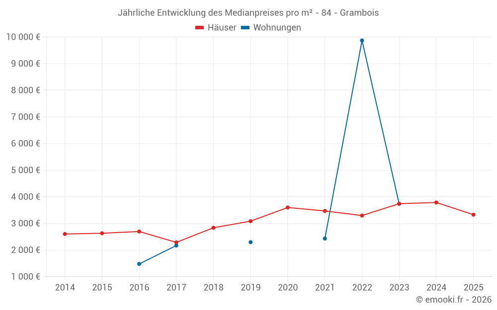 Der Durchschnittspreis auf den 25 Hausgeschäften der letzten 24 Monate in der Gemeinde Grambois betrug 3 647 € pro Quadratmeter für einen mittleren Immobilienwert von 415 000 €. Über diesen Zeitraum hinweg lagen 60% der Transaktionen zwischen 2 566 und 4 896 € pro Quadratmeter (vom 2. bis zum 8. Dezil).