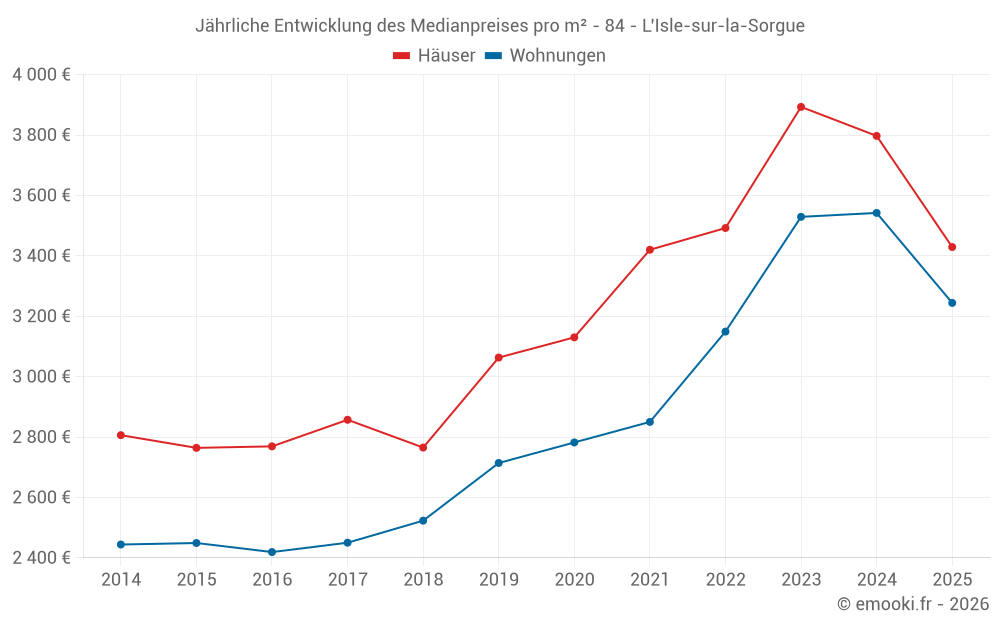 Der Durchschnittspreis auf den 30 Hausgeschäften der letzten 3 Monate in der Gemeinde L'Isle-sur-la-Sorgue betrug 3 548 € pro Quadratmeter für einen mittleren Immobilienwert von 305 000 €. Über diesen Zeitraum hinweg lagen 60% der Transaktionen zwischen 2 663 und 4 848 € pro Quadratmeter (vom 2. bis zum 8. Dezil).