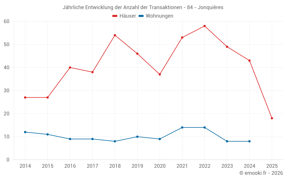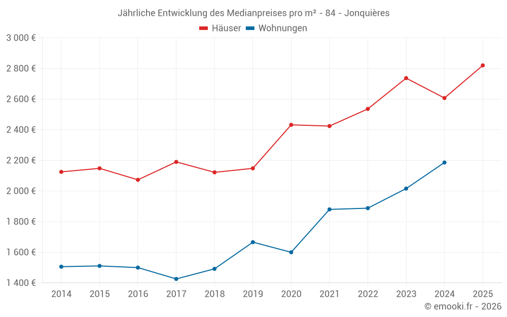 Der Durchschnittspreis auf den 18 Hausgeschäften der letzten 6 Monate in der Gemeinde Jonquières betrug 2 820 € pro Quadratmeter für einen mittleren Immobilienwert von 228 250 €. Über diesen Zeitraum hinweg lagen 60% der Transaktionen zwischen 1 507 und 3 403 € pro Quadratmeter (vom 2. bis zum 8. Dezil).