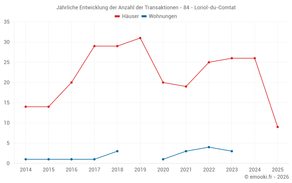 Der Durchschnittspreis auf den 23 Hausgeschäften der letzten 12 Monate in der Gemeinde Loriol-du-Comtat betrug 2 632 € pro Quadratmeter für einen mittleren Immobilienwert von 293 500 €. Über diesen Zeitraum hinweg lagen 60% der Transaktionen zwischen 1 861 und 3 328 € pro Quadratmeter (vom 2. bis zum 8. Dezil).
