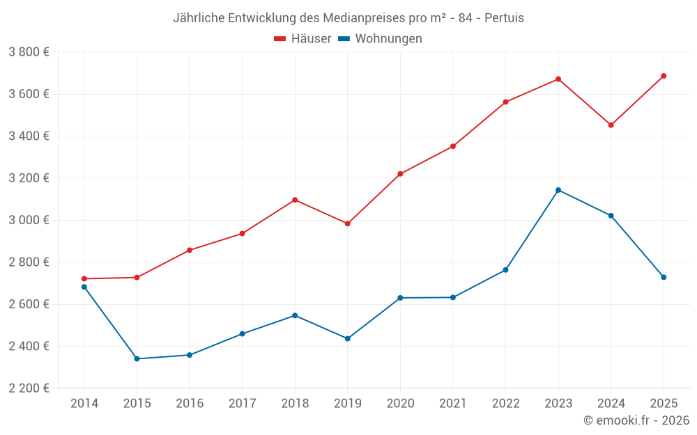 Der Durchschnittspreis auf den 22 Wohnungstransaktionen der letzten 3 Monate in der Gemeinde Pertuis betrug 2 958 € pro Quadratmeter für einen mittleren Immobilienwert von 167 500 €. Über diesen Zeitraum hinweg lagen 60% der Transaktionen zwischen 1 792 und 3 558 € pro Quadratmeter (vom 2. bis zum 8. Dezil).