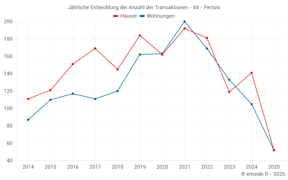 Der Durchschnittspreis auf den 26 Hausgeschäften der letzten 3 Monate in der Gemeinde Pertuis betrug 3 763 € pro Quadratmeter für einen mittleren Immobilienwert von 359 940 €. Über diesen Zeitraum hinweg lagen 60% der Transaktionen zwischen 2 857 und 4 333 € pro Quadratmeter (vom 2. bis zum 8. Dezil).