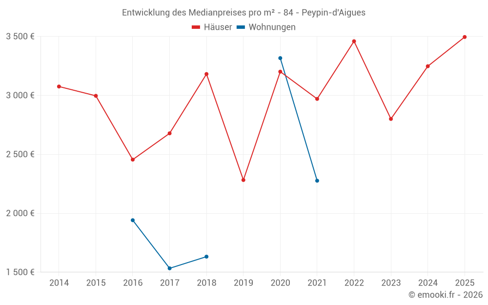 Der Durchschnittspreis auf den 20 Hausgeschäften der letzten 24 Monate in der Gemeinde Peypin-d'Aigues betrug 3 396 € pro Quadratmeter für einen mittleren Immobilienwert von 303 500 €. Über diesen Zeitraum hinweg lagen 60% der Transaktionen zwischen 2 379 und 4 437 € pro Quadratmeter (vom 2. bis zum 8. Dezil).