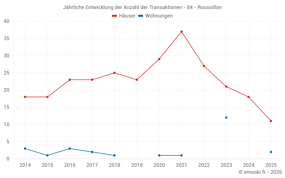 Der Durchschnittspreis auf den 23 Hausgeschäften der letzten 12 Monate in der Gemeinde Roussillon betrug 4 061 € pro Quadratmeter für einen mittleren Immobilienwert von 480 000 €. Über diesen Zeitraum hinweg lagen 60% der Transaktionen zwischen 2 804 und 5 271 € pro Quadratmeter (vom 2. bis zum 8. Dezil).