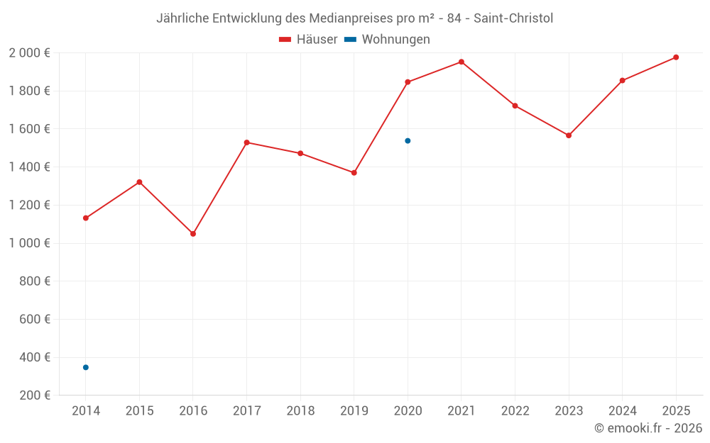 Der Durchschnittspreis auf den 18 Hausgeschäften der letzten 24 Monate in der Gemeinde Saint-Christol betrug 1 835 € pro Quadratmeter für einen mittleren Immobilienwert von 143 000 €. Über diesen Zeitraum hinweg lagen 60% der Transaktionen zwischen 1 295 und 2 559 € pro Quadratmeter (vom 2. bis zum 8. Dezil).