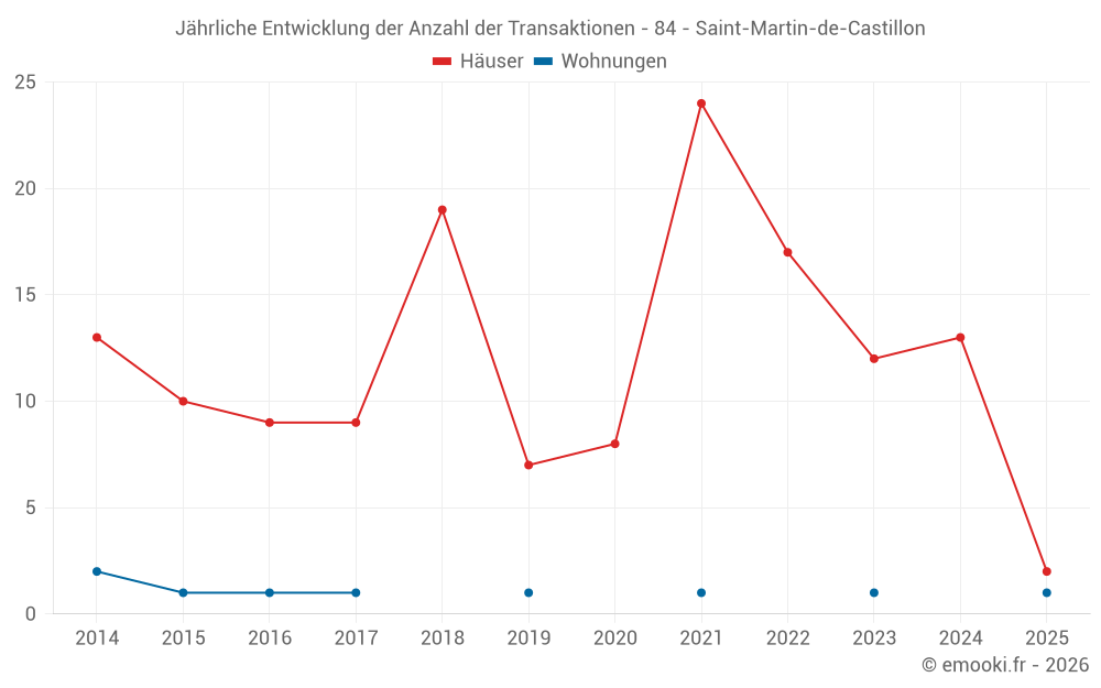 Der Durchschnittspreis auf den 20 Hausgeschäften der letzten 24 Monate in der Gemeinde Saint-Martin-de-Castillon betrug 2 544 € pro Quadratmeter für einen mittleren Immobilienwert von 290 000 €. Über diesen Zeitraum hinweg lagen 60% der Transaktionen zwischen 2 000 und 5 066 € pro Quadratmeter (vom 2. bis zum 8. Dezil).