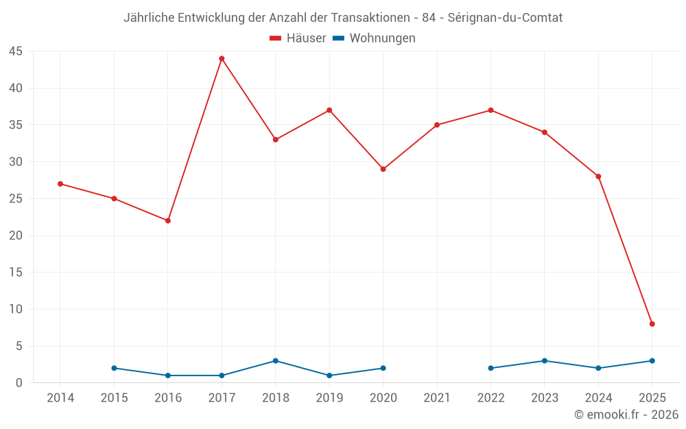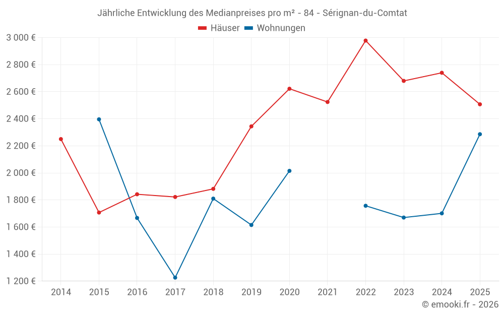 Der Durchschnittspreis auf den 27 Hausgeschäften der letzten 12 Monate in der Gemeinde Sérignan-du-Comtat betrug 2 598 € pro Quadratmeter für einen mittleren Immobilienwert von 230 000 €. Über diesen Zeitraum hinweg lagen 60% der Transaktionen zwischen 1 693 und 3 323 € pro Quadratmeter (vom 2. bis zum 8. Dezil).