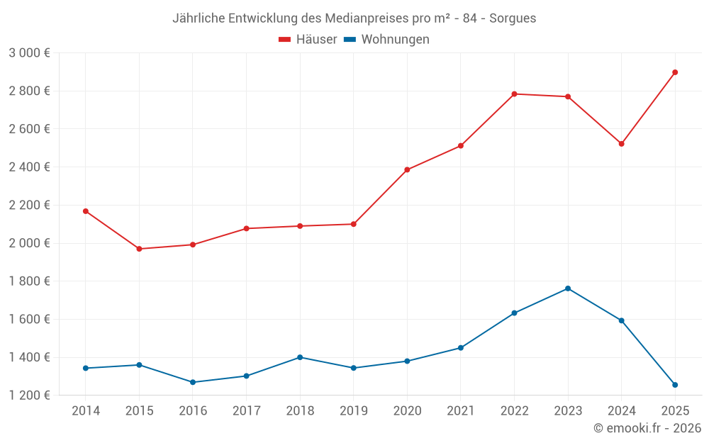 Der Durchschnittspreis auf den 32 Wohnungstransaktionen der letzten 6 Monate in der Gemeinde Sorgues betrug 1 255 € pro Quadratmeter für einen mittleren Immobilienwert von 78 000 €. Über diesen Zeitraum hinweg lagen 60% der Transaktionen zwischen 956 und 2 059 € pro Quadratmeter (vom 2. bis zum 8. Dezil).