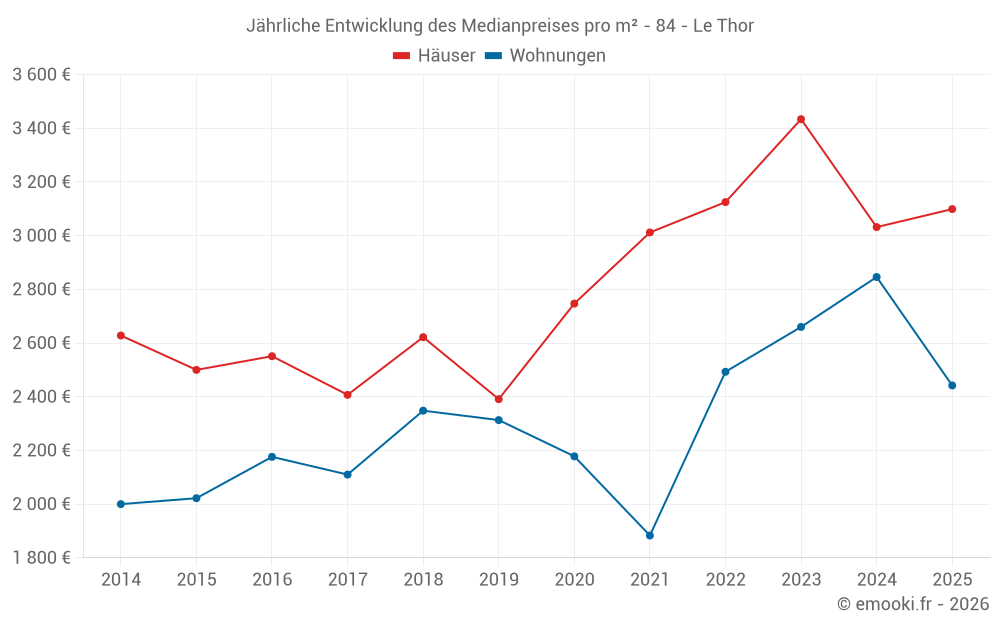 Der Durchschnittspreis auf den 28 Wohnungstransaktionen der letzten 12 Monate in der Gemeinde Le Thor betrug 2 699 € pro Quadratmeter für einen mittleren Immobilienwert von 139 450 €. Über diesen Zeitraum hinweg lagen 60% der Transaktionen zwischen 2 095 und 3 163 € pro Quadratmeter (vom 2. bis zum 8. Dezil).
