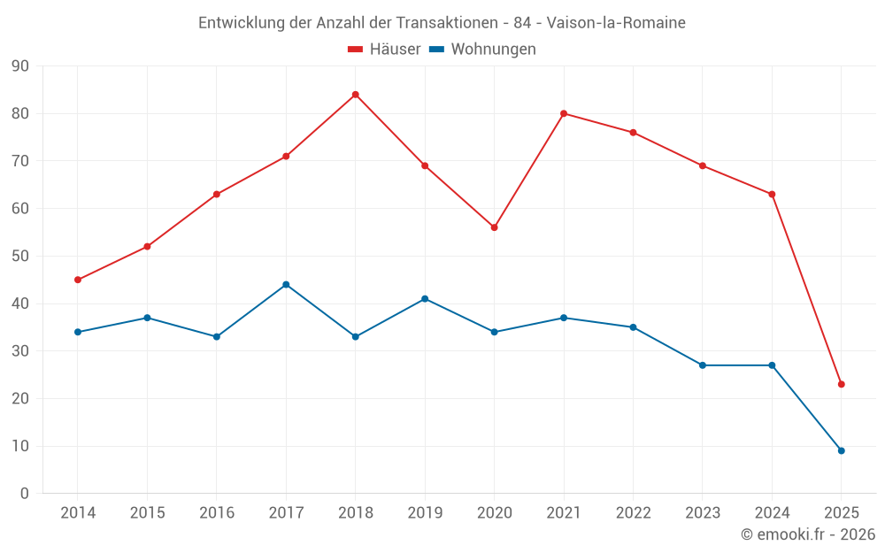 Der Durchschnittspreis auf den 23 Hausgeschäften der letzten 6 Monate in der Gemeinde Vaison-la-Romaine betrug 3 538 € pro Quadratmeter für einen mittleren Immobilienwert von 310 000 €. Über diesen Zeitraum hinweg lagen 60% der Transaktionen zwischen 2 938 und 4 320 € pro Quadratmeter (vom 2. bis zum 8. Dezil).