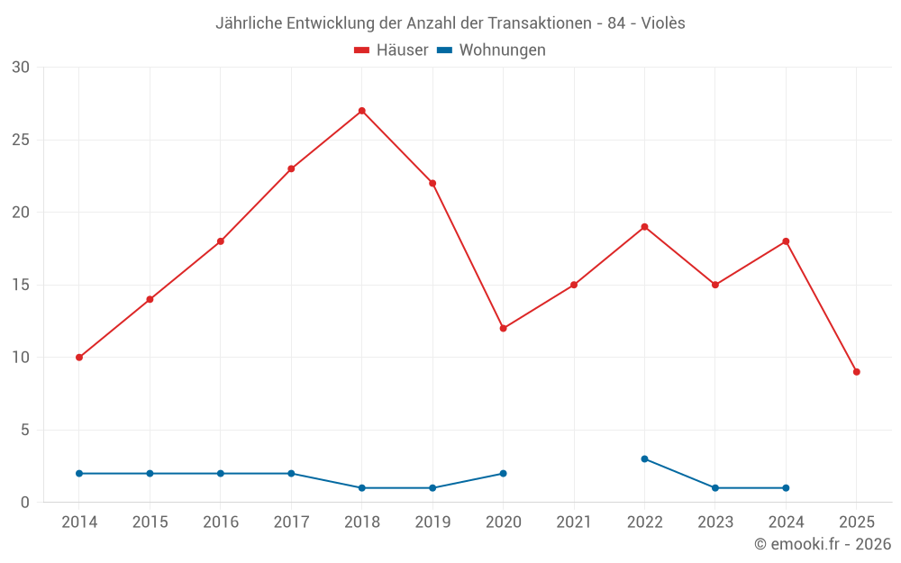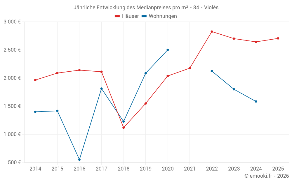 Der Durchschnittspreis auf den 17 Hausgeschäften der letzten 12 Monate in der Gemeinde Violès betrug 2 704 € pro Quadratmeter für einen mittleren Immobilienwert von 263 000 €. Über diesen Zeitraum hinweg lagen 60% der Transaktionen zwischen 1 764 und 3 153 € pro Quadratmeter (vom 2. bis zum 8. Dezil).