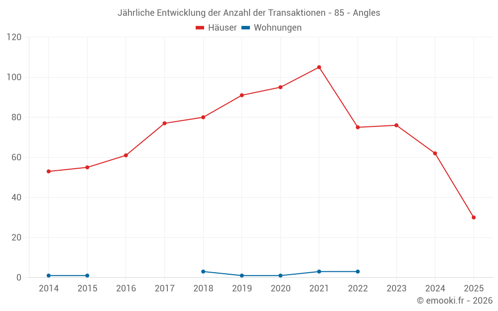 Der Durchschnittspreis auf den 30 Hausgeschäften der letzten 6 Monate in der Gemeinde Angles betrug 2 822 € pro Quadratmeter für einen mittleren Immobilienwert von 205 000 €. Über diesen Zeitraum hinweg lagen 60% der Transaktionen zwischen 2 507 und 3 213 € pro Quadratmeter (vom 2. bis zum 8. Dezil).