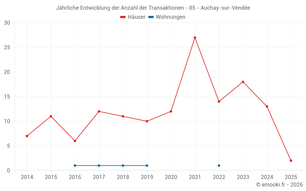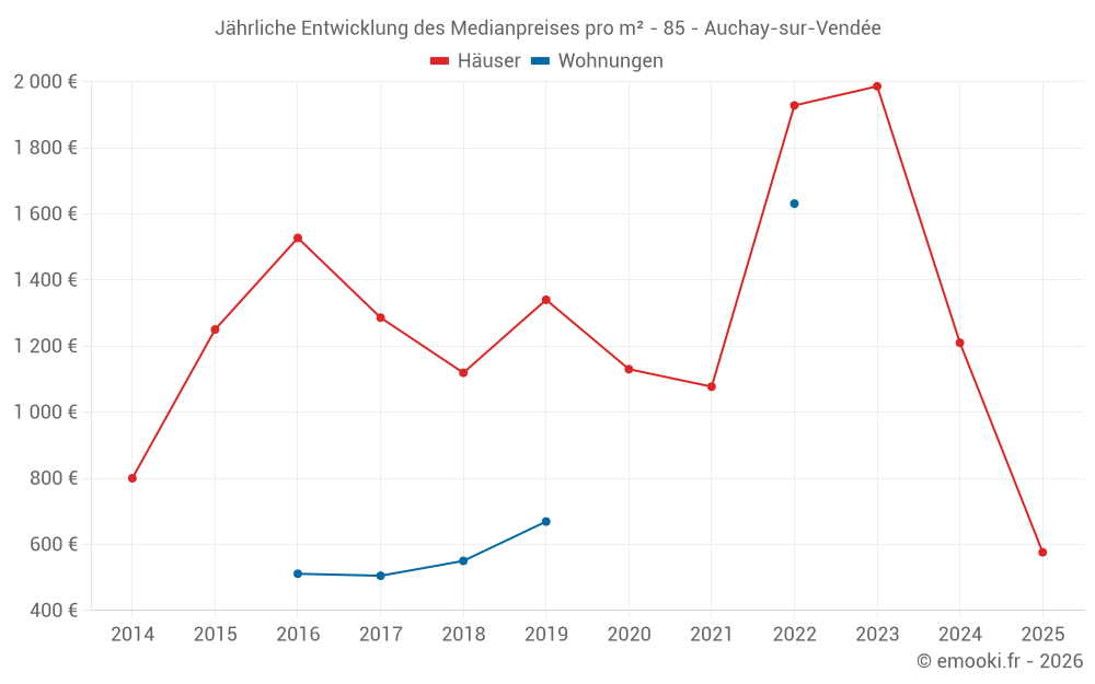 Der Durchschnittspreis auf den 22 Hausgeschäften der letzten 24 Monate in der Gemeinde Auchay-sur-Vendée betrug 1 080 € pro Quadratmeter für einen mittleren Immobilienwert von 131 000 €. Über diesen Zeitraum hinweg lagen 60% der Transaktionen zwischen 541 und 1 798 € pro Quadratmeter (vom 2. bis zum 8. Dezil).