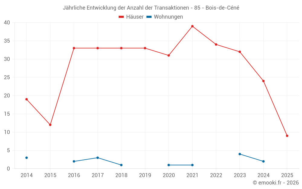 Der Durchschnittspreis auf den 23 Hausgeschäften der letzten 12 Monate in der Gemeinde Bois-de-Céné betrug 2 005 € pro Quadratmeter für einen mittleren Immobilienwert von 187 500 €. Über diesen Zeitraum hinweg lagen 60% der Transaktionen zwischen 1 176 und 2 628 € pro Quadratmeter (vom 2. bis zum 8. Dezil).