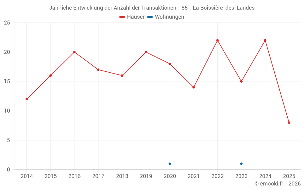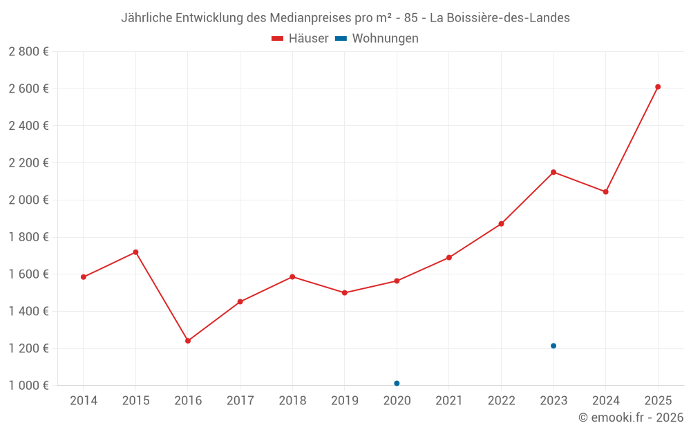 Der Durchschnittspreis auf den 20 Hausgeschäften der letzten 12 Monate in der Gemeinde La Boissière-des-Landes betrug 2 288 € pro Quadratmeter für einen mittleren Immobilienwert von 169 500 €. Über diesen Zeitraum hinweg lagen 60% der Transaktionen zwischen 1 456 und 2 724 € pro Quadratmeter (vom 2. bis zum 8. Dezil).
