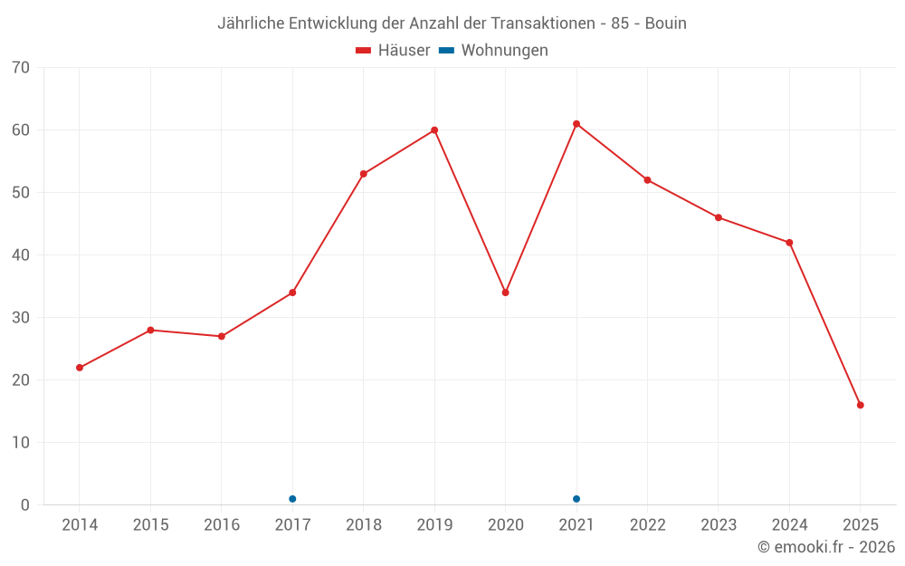 Der Durchschnittspreis auf den 39 Hausgeschäften der letzten 12 Monate in der Gemeinde Bouin betrug 2 210 € pro Quadratmeter für einen mittleren Immobilienwert von 150 000 €. Über diesen Zeitraum hinweg lagen 60% der Transaktionen zwischen 1 333 und 2 833 € pro Quadratmeter (vom 2. bis zum 8. Dezil).