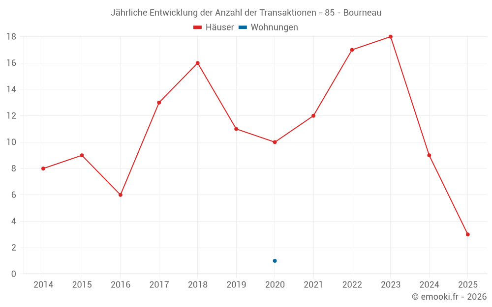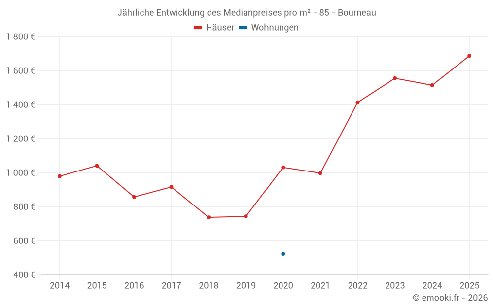 Der Durchschnittspreis auf den 21 Hausgeschäften der letzten 24 Monate in der Gemeinde Bourneau betrug 1 515 € pro Quadratmeter für einen mittleren Immobilienwert von 140 700 €. Über diesen Zeitraum hinweg lagen 60% der Transaktionen zwischen 1 116 und 1 900 € pro Quadratmeter (vom 2. bis zum 8. Dezil).