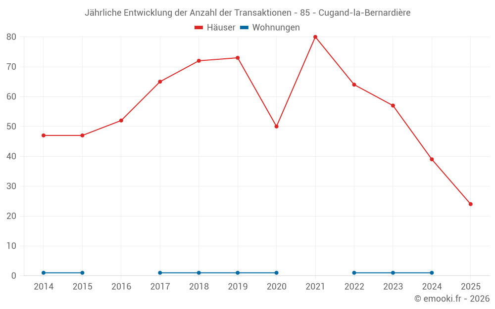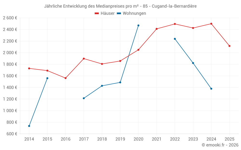 Der Durchschnittspreis auf den 24 Hausgeschäften der letzten 6 Monate in der Gemeinde Cugand-la-Bernardière betrug 2 116 € pro Quadratmeter für einen mittleren Immobilienwert von 158 500 €. Über diesen Zeitraum hinweg lagen 60% der Transaktionen zwischen 1 467 und 2 796 € pro Quadratmeter (vom 2. bis zum 8. Dezil).