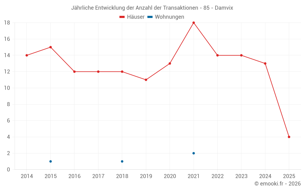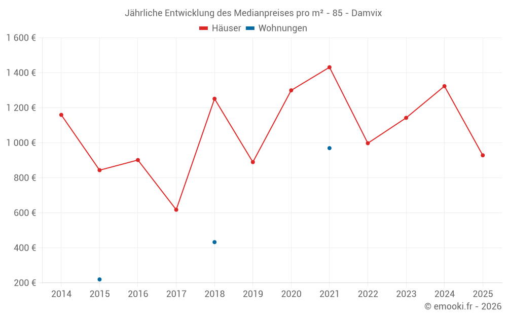 Der Durchschnittspreis auf den 24 Hausgeschäften der letzten 24 Monate in der Gemeinde Damvix betrug 1 312 € pro Quadratmeter für einen mittleren Immobilienwert von 115 500 €. Über diesen Zeitraum hinweg lagen 60% der Transaktionen zwischen 622 und 2 051 € pro Quadratmeter (vom 2. bis zum 8. Dezil).