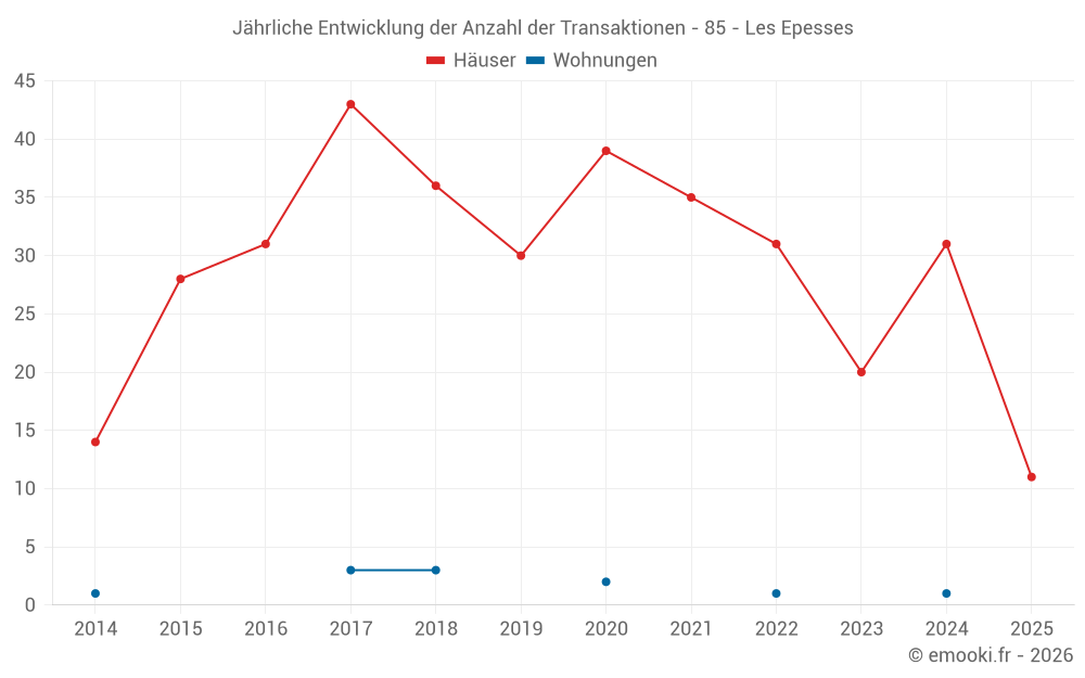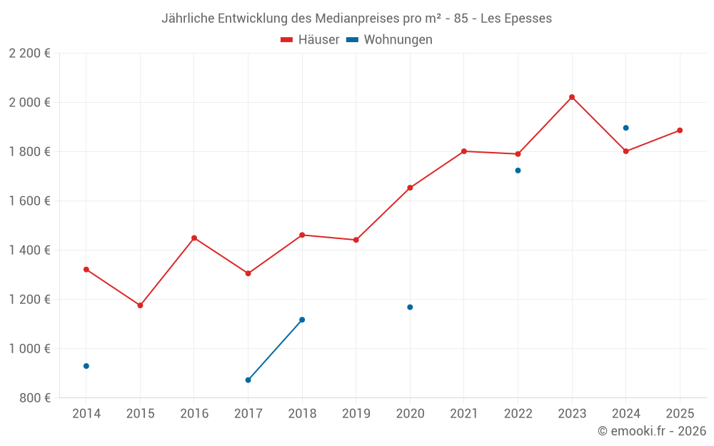 Der Durchschnittspreis auf den 29 Hausgeschäften der letzten 12 Monate in der Gemeinde Les Epesses betrug 1 887 € pro Quadratmeter für einen mittleren Immobilienwert von 165 000 €. Über diesen Zeitraum hinweg lagen 60% der Transaktionen zwischen 1 355 und 2 323 € pro Quadratmeter (vom 2. bis zum 8. Dezil).