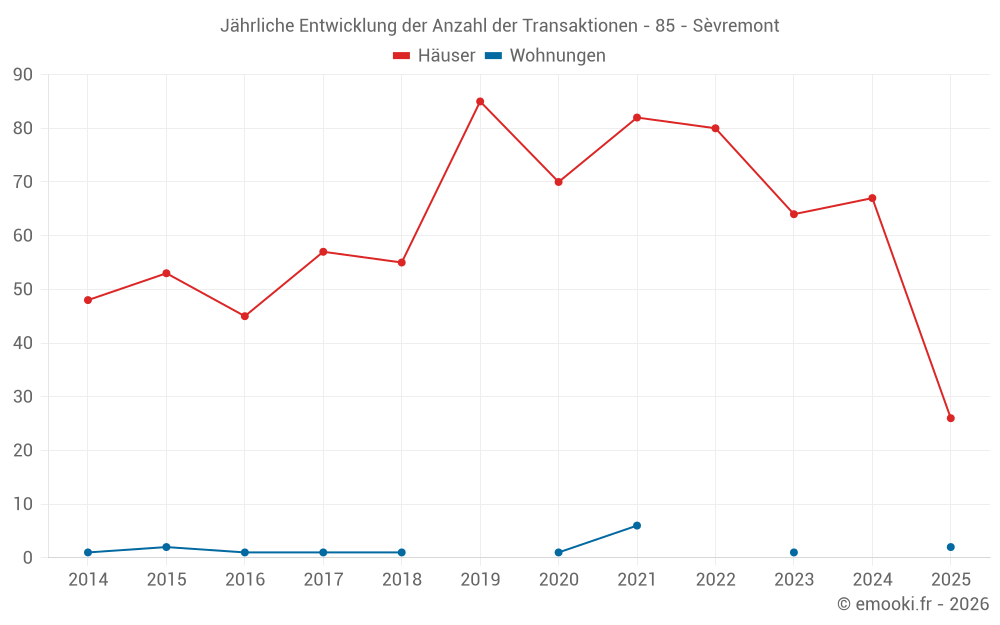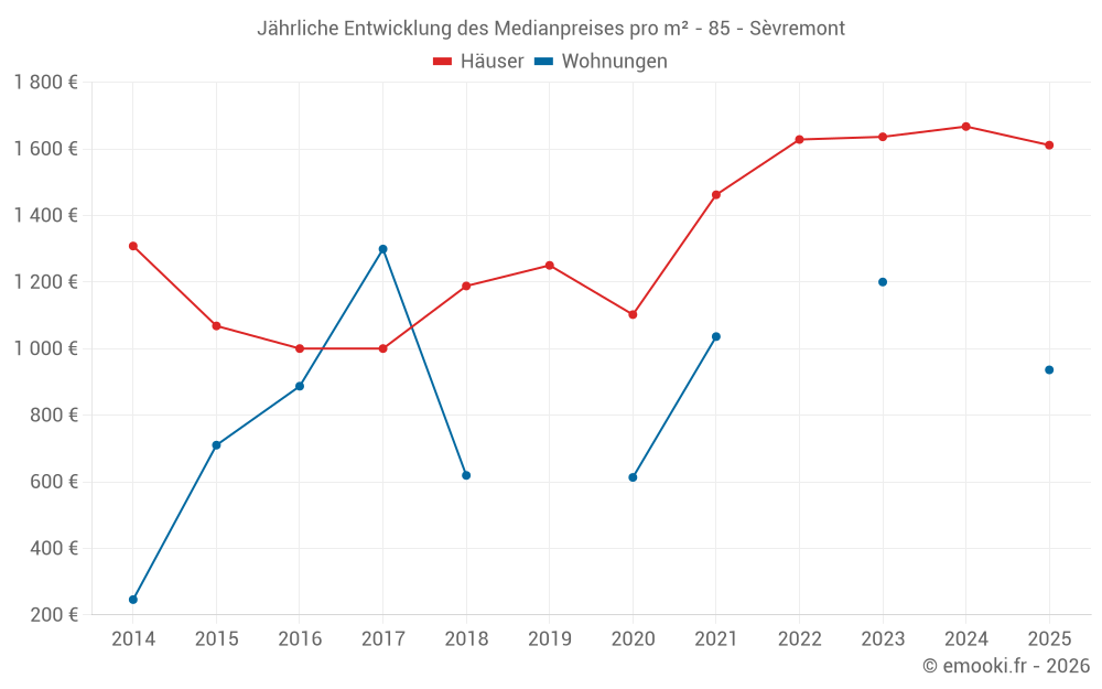 Der Durchschnittspreis auf den 26 Hausgeschäften der letzten 6 Monate in der Gemeinde Sèvremont betrug 1 611 € pro Quadratmeter für einen mittleren Immobilienwert von 165 000 €. Über diesen Zeitraum hinweg lagen 60% der Transaktionen zwischen 1 111 und 2 000 € pro Quadratmeter (vom 2. bis zum 8. Dezil).