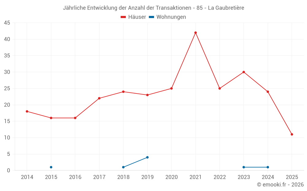 Der Durchschnittspreis auf den 22 Hausgeschäften der letzten 12 Monate in der Gemeinde La Gaubretière betrug 2 000 € pro Quadratmeter für einen mittleren Immobilienwert von 210 000 €. Über diesen Zeitraum hinweg lagen 60% der Transaktionen zwischen 1 689 und 2 366 € pro Quadratmeter (vom 2. bis zum 8. Dezil).