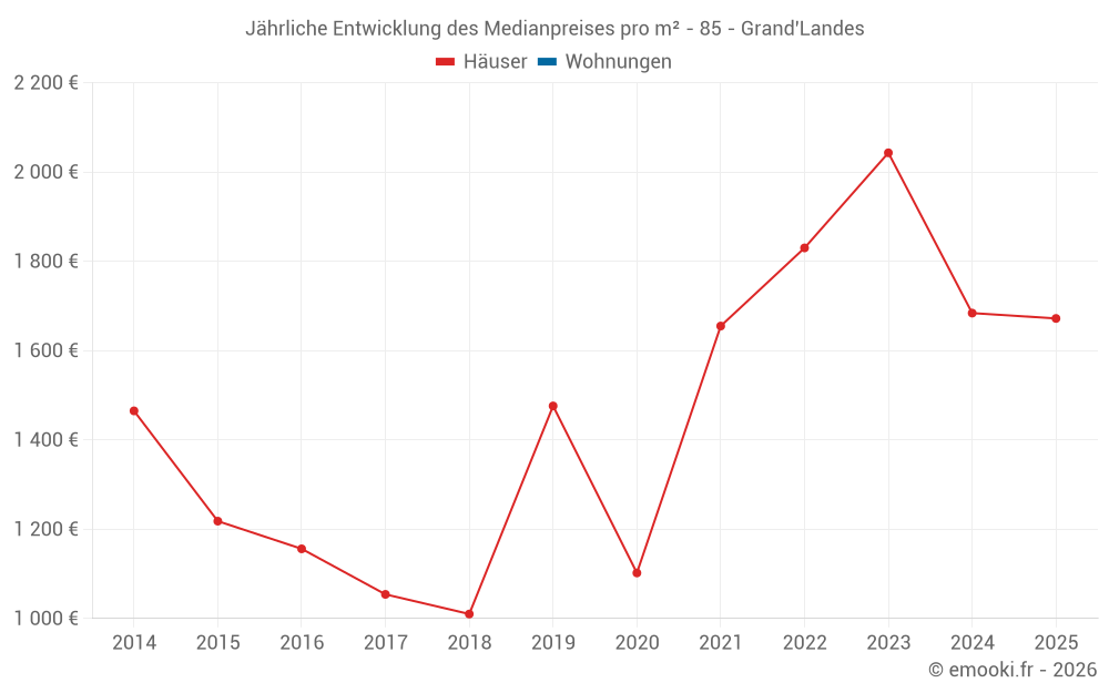 Der Durchschnittspreis auf den 23 Hausgeschäften der letzten 24 Monate in der Gemeinde Grand'Landes betrug 1 702 € pro Quadratmeter für einen mittleren Immobilienwert von 170 000 €. Über diesen Zeitraum hinweg lagen 60% der Transaktionen zwischen 1 311 und 2 199 € pro Quadratmeter (vom 2. bis zum 8. Dezil).