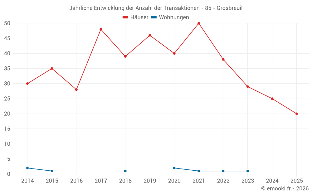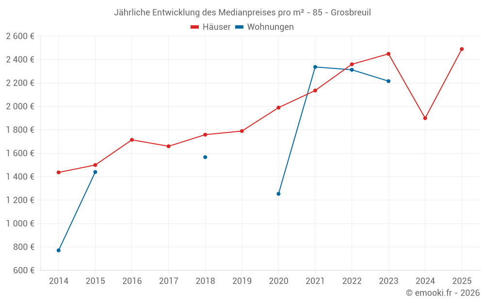 Der Durchschnittspreis auf den 20 Hausgeschäften der letzten 6 Monate in der Gemeinde Grosbreuil betrug 2 490 € pro Quadratmeter für einen mittleren Immobilienwert von 247 500 €. Über diesen Zeitraum hinweg lagen 60% der Transaktionen zwischen 2 084 und 2 992 € pro Quadratmeter (vom 2. bis zum 8. Dezil).