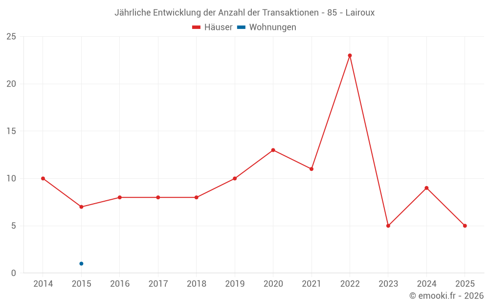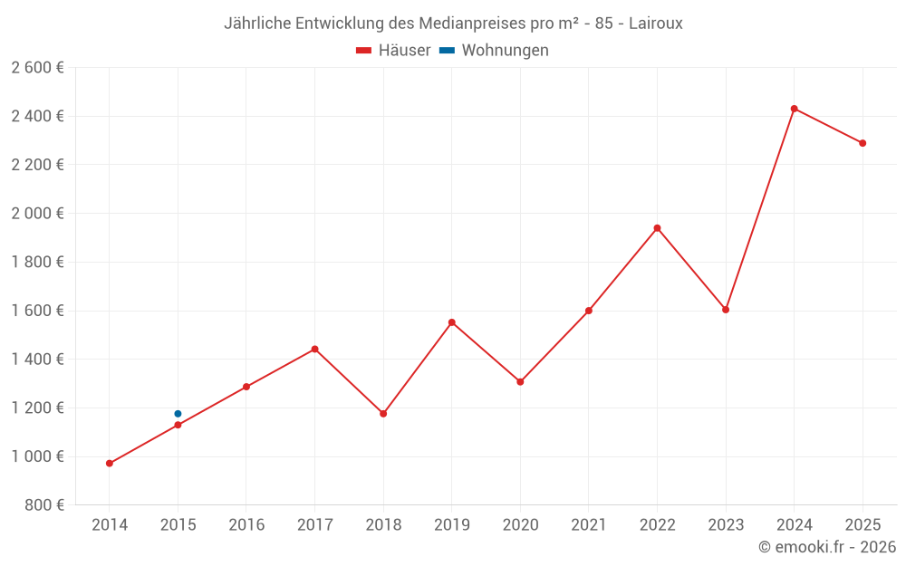 Der Durchschnittspreis auf den 18 Hausgeschäften der letzten 24 Monate in der Gemeinde Lairoux betrug 2 098 € pro Quadratmeter für einen mittleren Immobilienwert von 162 500 €. Über diesen Zeitraum hinweg lagen 60% der Transaktionen zwischen 1 242 und 2 803 € pro Quadratmeter (vom 2. bis zum 8. Dezil).