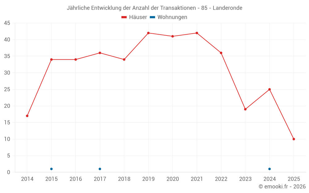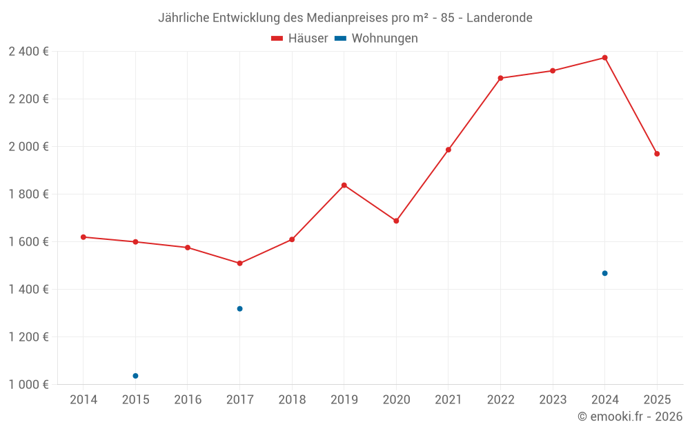 Der Durchschnittspreis auf den 26 Hausgeschäften der letzten 12 Monate in der Gemeinde Landeronde betrug 2 287 € pro Quadratmeter für einen mittleren Immobilienwert von 211 635 €. Über diesen Zeitraum hinweg lagen 60% der Transaktionen zwischen 1 525 und 2 692 € pro Quadratmeter (vom 2. bis zum 8. Dezil).