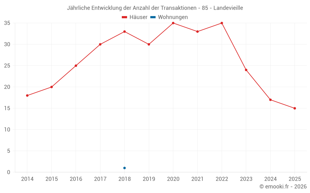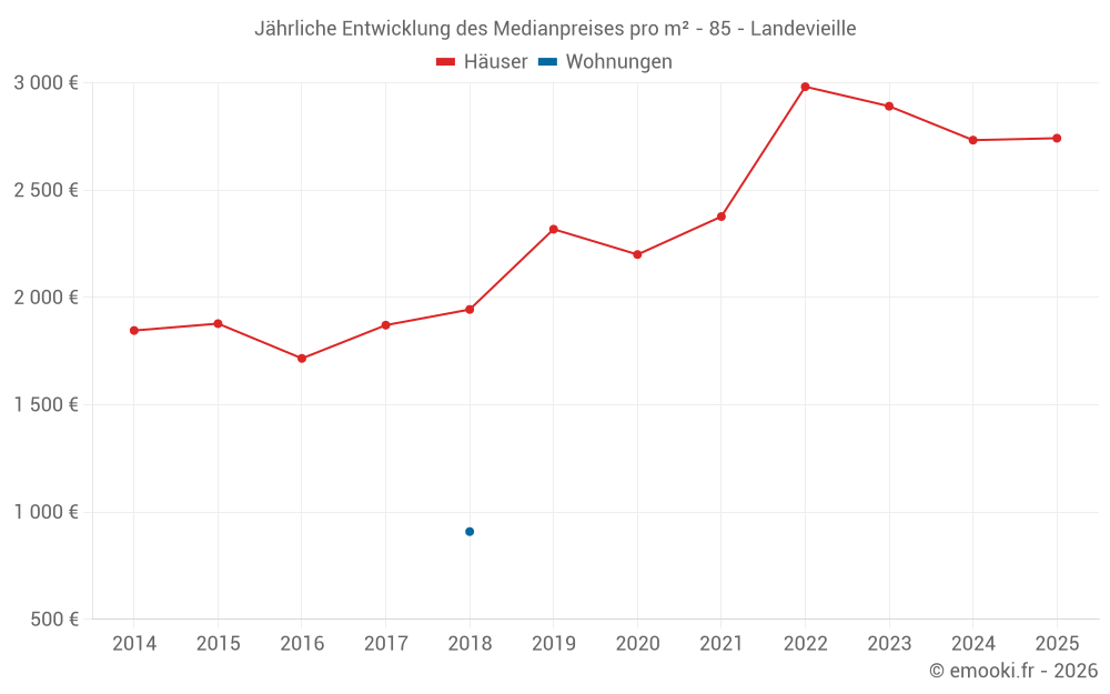 Der Durchschnittspreis auf den 26 Hausgeschäften der letzten 12 Monate in der Gemeinde Landevieille betrug 2 765 € pro Quadratmeter für einen mittleren Immobilienwert von 236 000 €. Über diesen Zeitraum hinweg lagen 60% der Transaktionen zwischen 1 971 und 3 378 € pro Quadratmeter (vom 2. bis zum 8. Dezil).