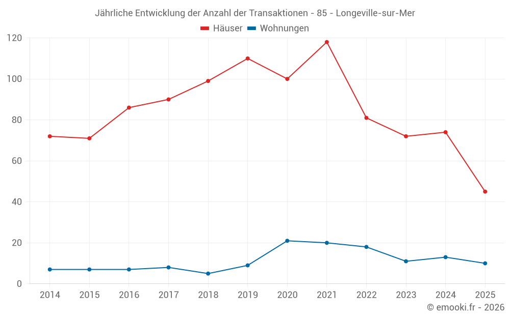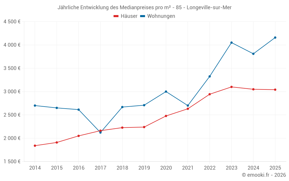 Der Durchschnittspreis auf den 16 Wohnungstransaktionen der letzten 12 Monate in der Gemeinde Longeville-sur-Mer betrug 4 158 € pro Quadratmeter für einen mittleren Immobilienwert von 151 650 €. Über diesen Zeitraum hinweg lagen 60% der Transaktionen zwischen 2 662 und 4 876 € pro Quadratmeter (vom 2. bis zum 8. Dezil).