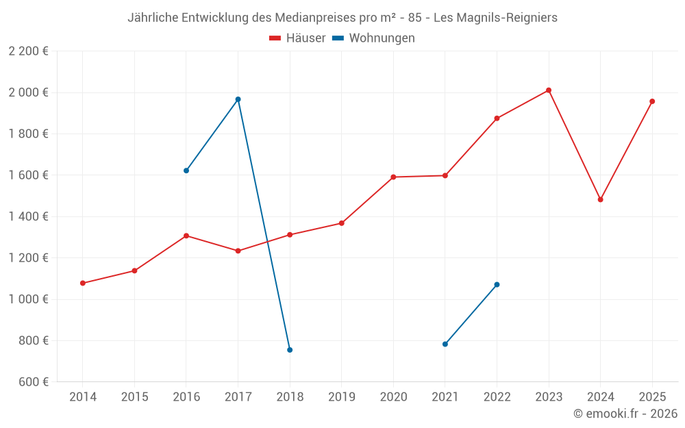 Der Durchschnittspreis auf den 31 Hausgeschäften der letzten 24 Monate in der Gemeinde Les Magnils-Reigniers betrug 1 600 € pro Quadratmeter für einen mittleren Immobilienwert von 156 000 €. Über diesen Zeitraum hinweg lagen 60% der Transaktionen zwischen 797 und 2 366 € pro Quadratmeter (vom 2. bis zum 8. Dezil).