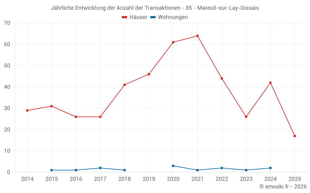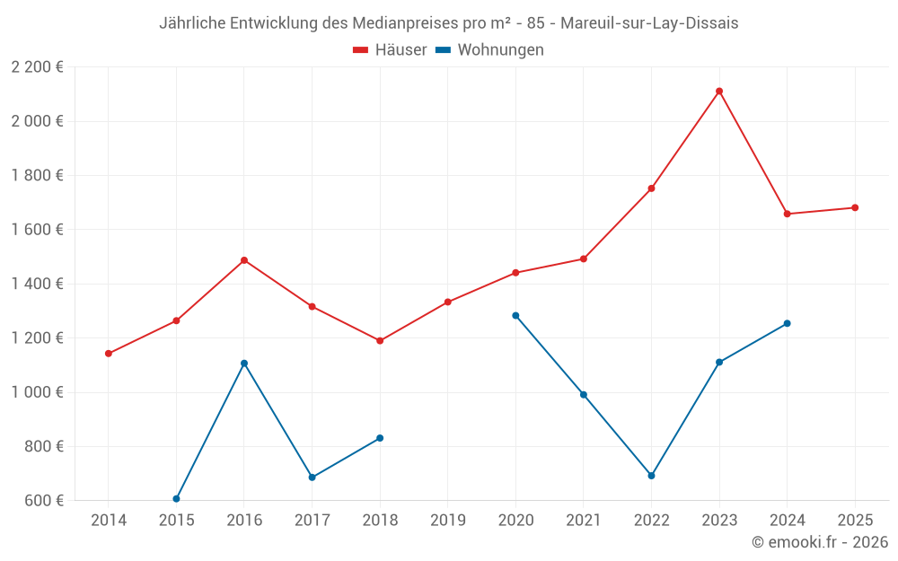 Der Durchschnittspreis auf den 39 Hausgeschäften der letzten 12 Monate in der Gemeinde Mareuil-sur-Lay-Dissais betrug 1 667 € pro Quadratmeter für einen mittleren Immobilienwert von 155 000 €. Über diesen Zeitraum hinweg lagen 60% der Transaktionen zwischen 1 297 und 2 039 € pro Quadratmeter (vom 2. bis zum 8. Dezil).
