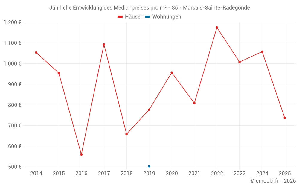 Der Durchschnittspreis auf den 16 Hausgeschäften der letzten 24 Monate in der Gemeinde Marsais-Sainte-Radégonde betrug 1 040 € pro Quadratmeter für einen mittleren Immobilienwert von 117 000 €. Über diesen Zeitraum hinweg lagen 60% der Transaktionen zwischen 580 und 1 980 € pro Quadratmeter (vom 2. bis zum 8. Dezil).