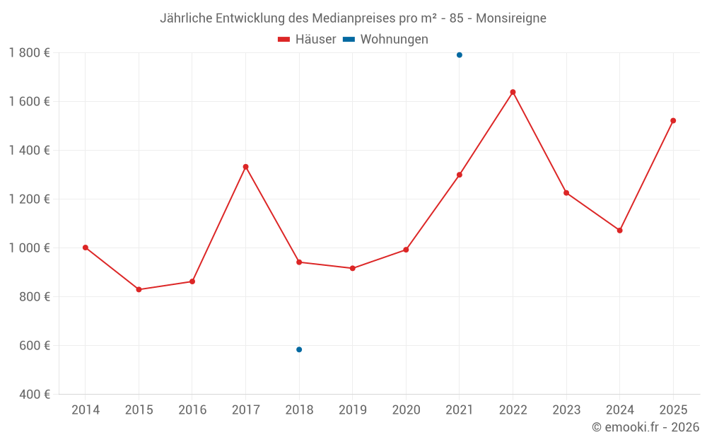 Der Durchschnittspreis auf den 18 Hausgeschäften der letzten 24 Monate in der Gemeinde Monsireigne betrug 1 184 € pro Quadratmeter für einen mittleren Immobilienwert von 112 250 €. Über diesen Zeitraum hinweg lagen 60% der Transaktionen zwischen 873 und 1 676 € pro Quadratmeter (vom 2. bis zum 8. Dezil).