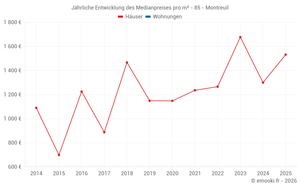 Der Durchschnittspreis auf den 23 Hausgeschäften der letzten 24 Monate in der Gemeinde Montreuil betrug 1 322 € pro Quadratmeter für einen mittleren Immobilienwert von 163 000 €. Über diesen Zeitraum hinweg lagen 60% der Transaktionen zwischen 973 und 1 876 € pro Quadratmeter (vom 2. bis zum 8. Dezil).