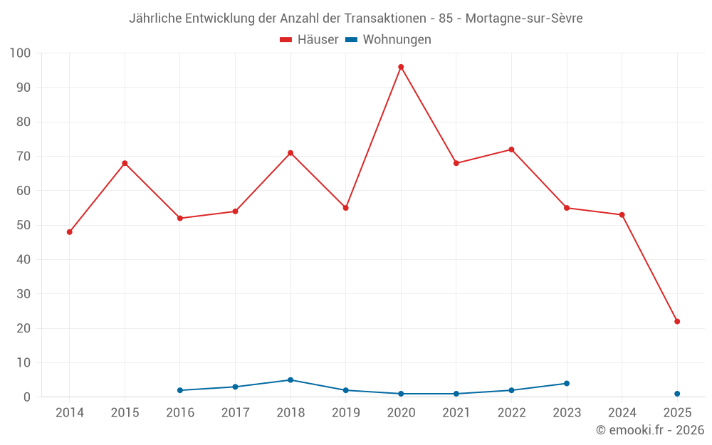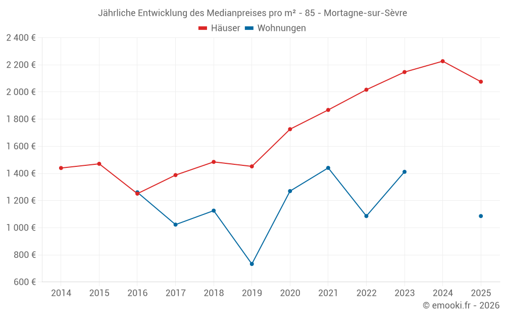 Der Durchschnittspreis auf den 22 Hausgeschäften der letzten 6 Monate in der Gemeinde Mortagne-sur-Sèvre betrug 2 076 € pro Quadratmeter für einen mittleren Immobilienwert von 226 000 €. Über diesen Zeitraum hinweg lagen 60% der Transaktionen zwischen 1 525 und 2 516 € pro Quadratmeter (vom 2. bis zum 8. Dezil).