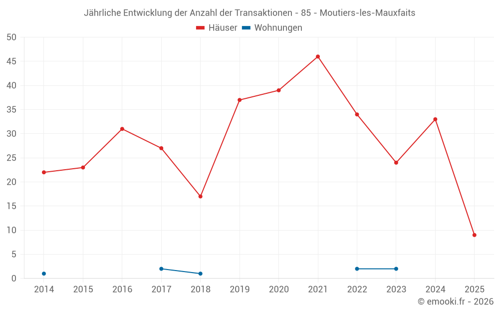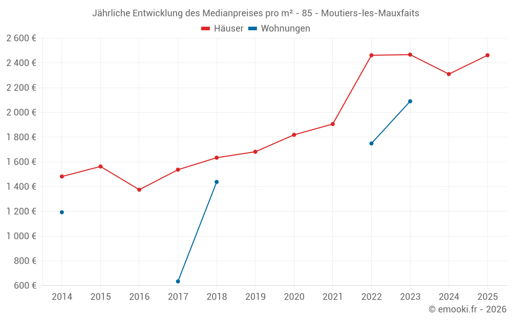 Der Durchschnittspreis auf den 22 Hausgeschäften der letzten 12 Monate in der Gemeinde Moutiers-les-Mauxfaits betrug 2 412 € pro Quadratmeter für einen mittleren Immobilienwert von 199 000 €. Über diesen Zeitraum hinweg lagen 60% der Transaktionen zwischen 2 036 und 2 918 € pro Quadratmeter (vom 2. bis zum 8. Dezil).