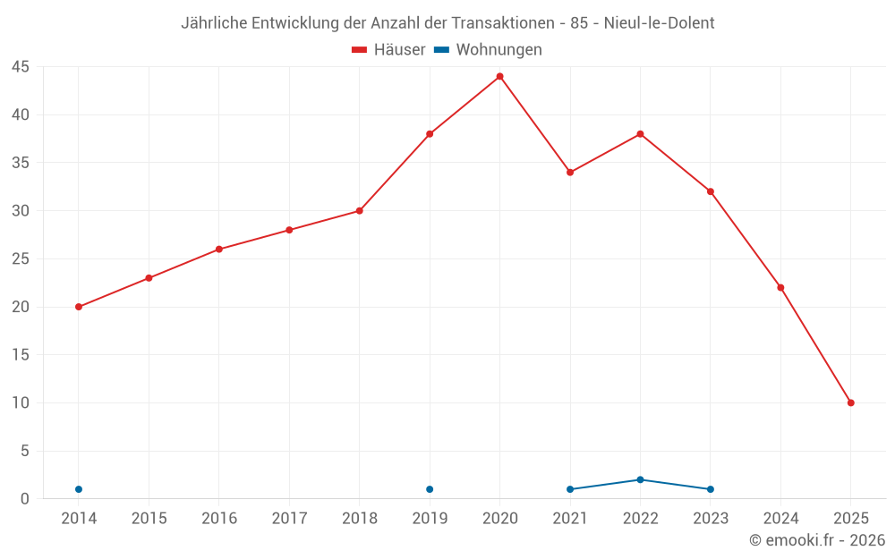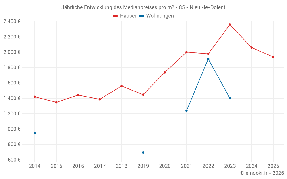 Der Durchschnittspreis auf den 25 Hausgeschäften der letzten 12 Monate in der Gemeinde Nieul-le-Dolent betrug 2 012 € pro Quadratmeter für einen mittleren Immobilienwert von 178 400 €. Über diesen Zeitraum hinweg lagen 60% der Transaktionen zwischen 1 492 und 2 628 € pro Quadratmeter (vom 2. bis zum 8. Dezil).